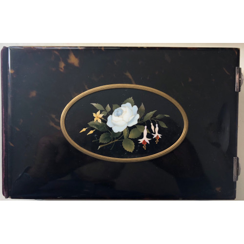 Binding | oblong folio (155 x 250mm) tortoiseshell, inlaid mosiac of flowers within gilt metal oval on front cover, filigre metalwork in centre of rear cover, red velvet spine, a.e.g, silver metal clasps, watered silk endpapers, hinges spilt, |
