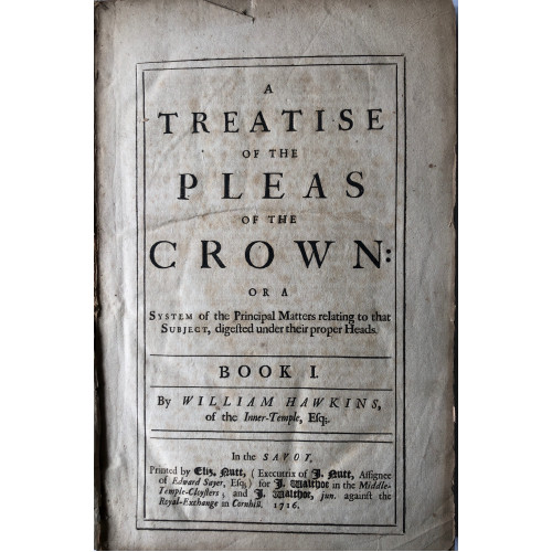 The second book was not published until 1721. Elizabeth Nutt [c.1666-1746] who took over her husband's business on his death in 1716, was one of the few early women law book printers. William Hawkins (1681/2-1750), serjeant-at-law and legal writer, was appointed serjeant at Inner Temple in 1724 and is best known for his "Pleas of the Crown" (1716-21) the "first substantial exposition of English criminal law to be printed since that by Sir Edward Coke