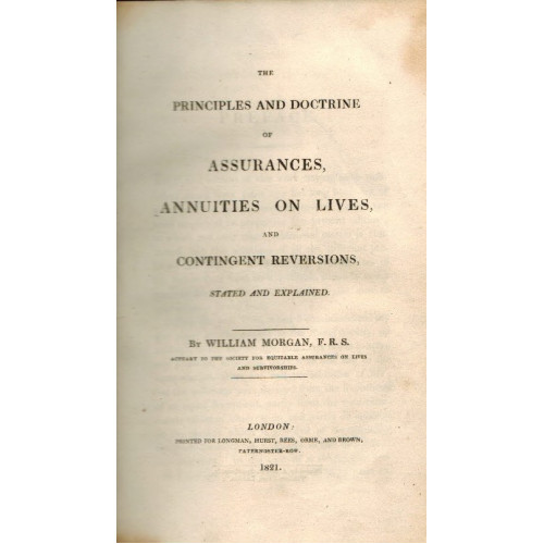 William Morgan [1750-1833] was Actuary to the Society for Equitable Assurances. He used probability equations to determine the Society's exposure to risk and hence the value of their assets. This work is a revision of his 'Doctrine of Annuities and Assurances on Lives and Survivorships Stated and Explained' published in 1779. 'Morgan ranks high among the pioneers of scientific life assurance in England' Oxford DNB.