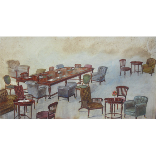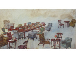 The firm of Jellinek were based in Paris at 95 rue Faubourg. They specialised in making leather chairs in the English style. Presumably this watercolour was to be used to illustrate one of the firm's catalogues.
